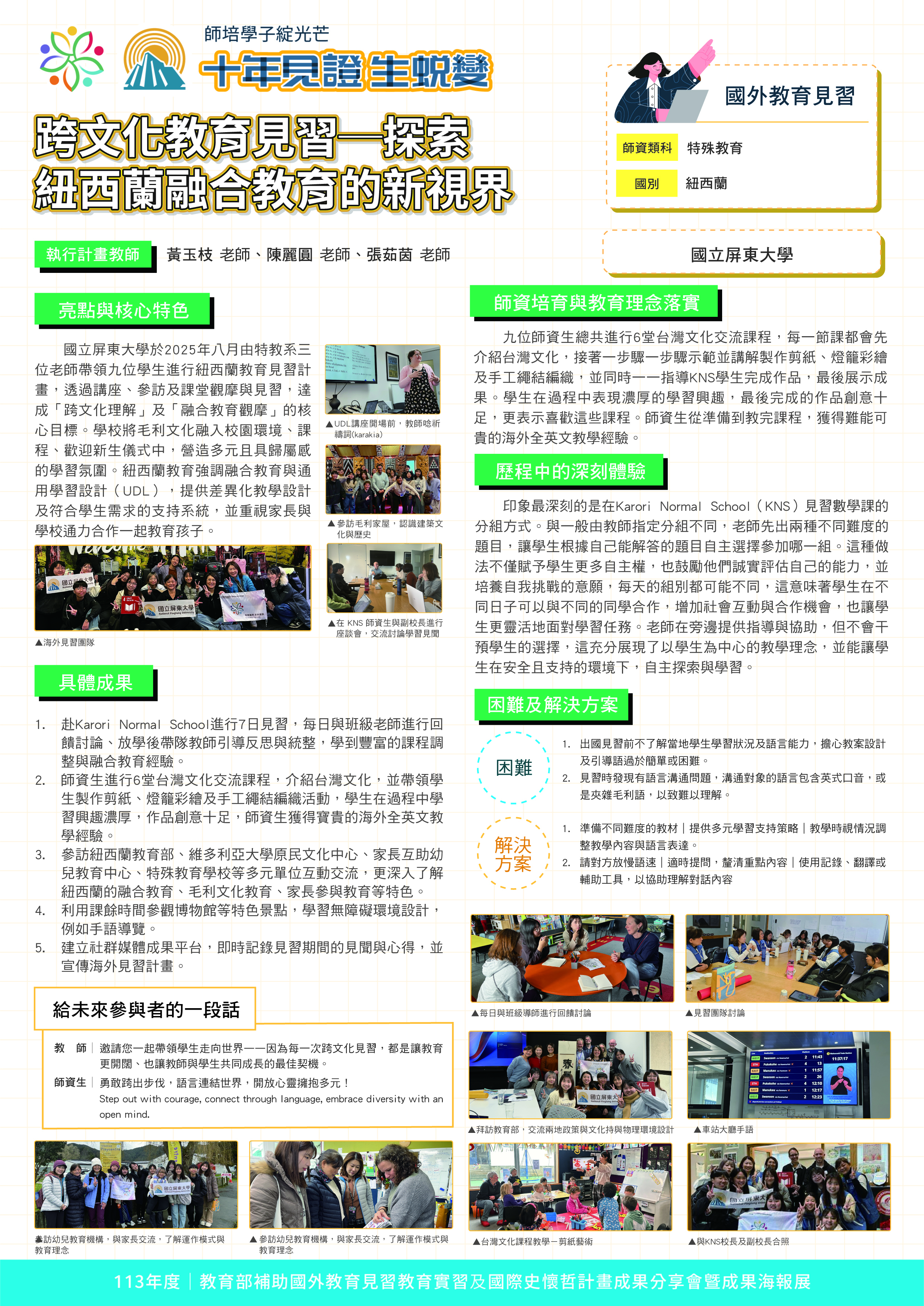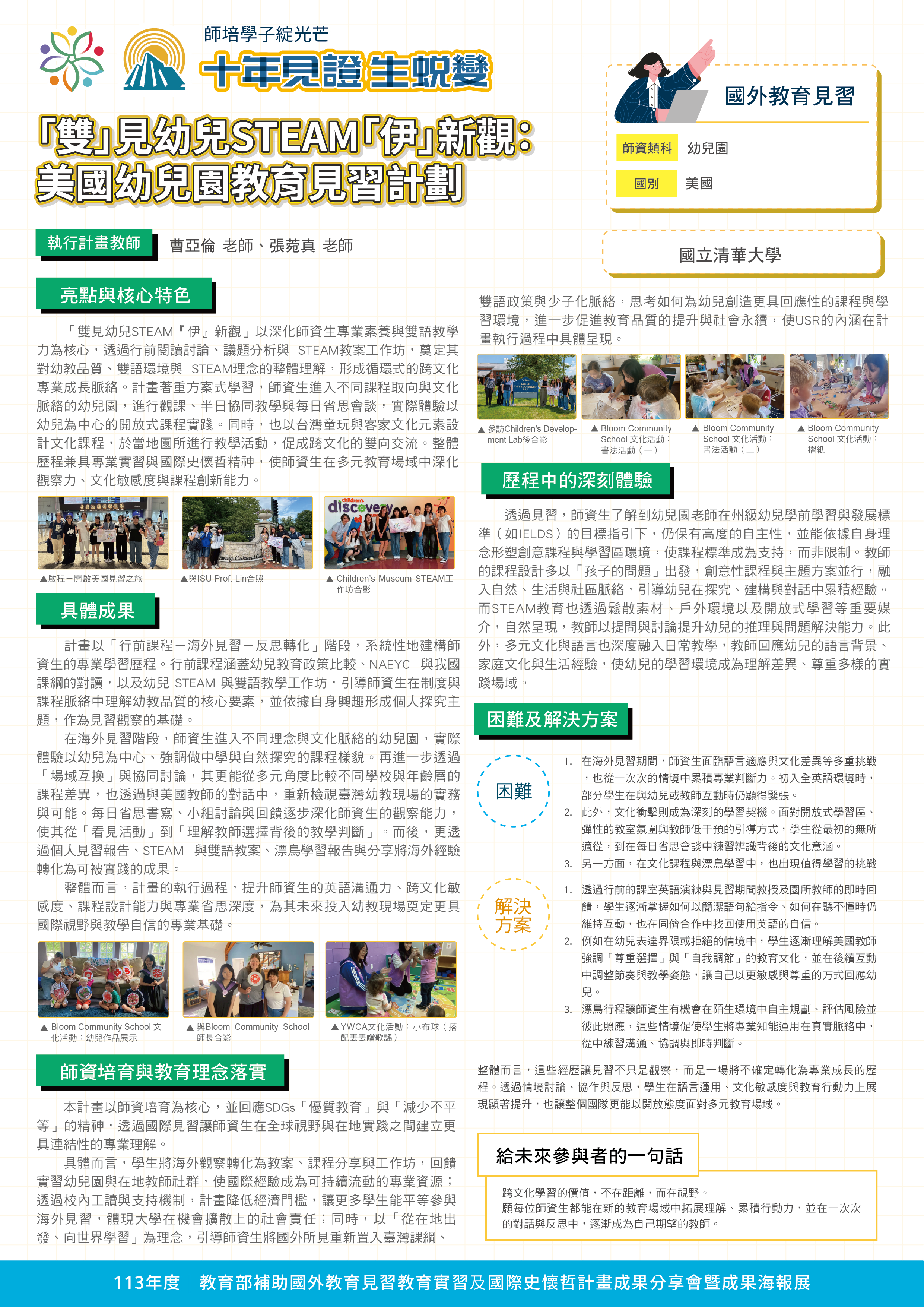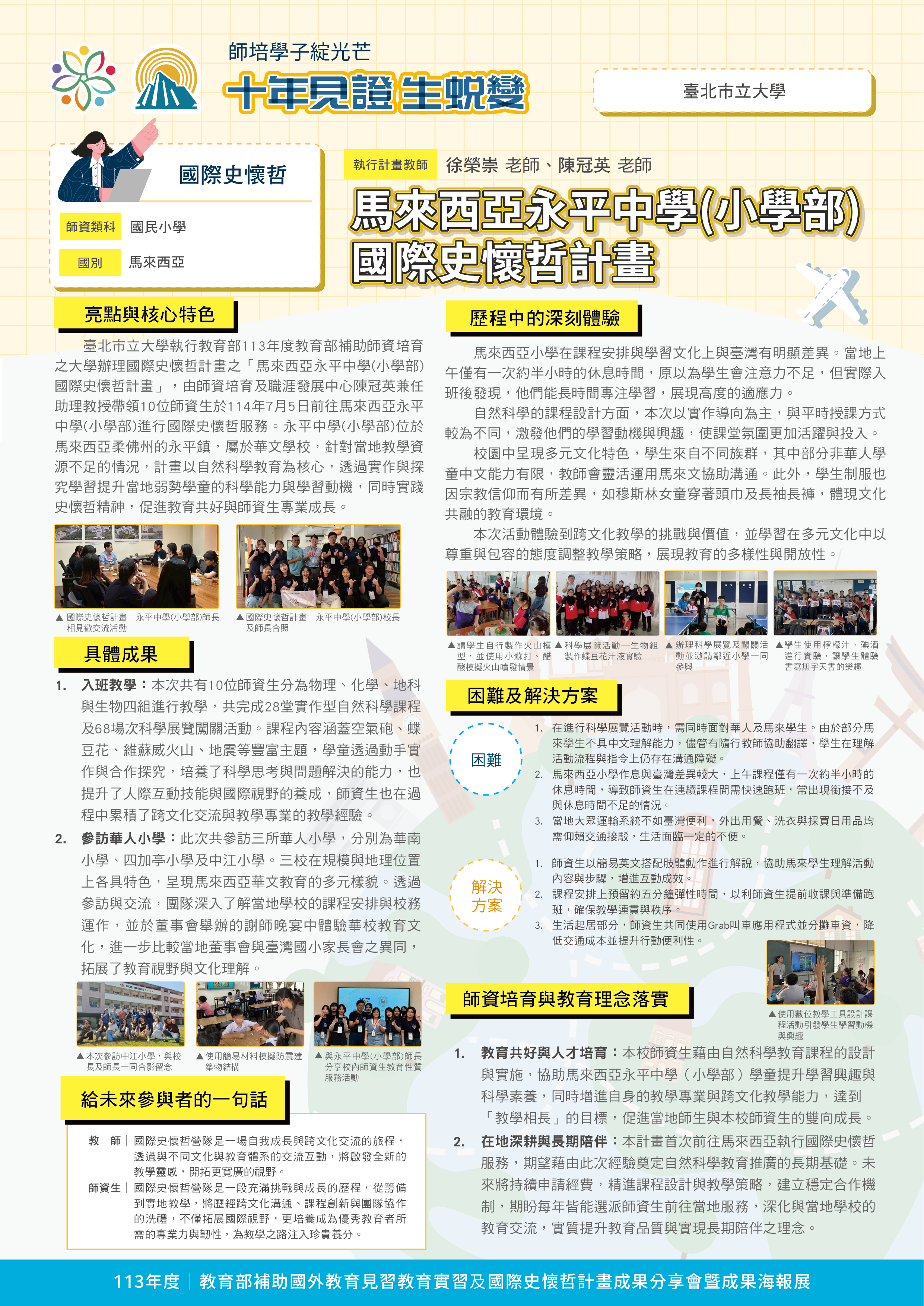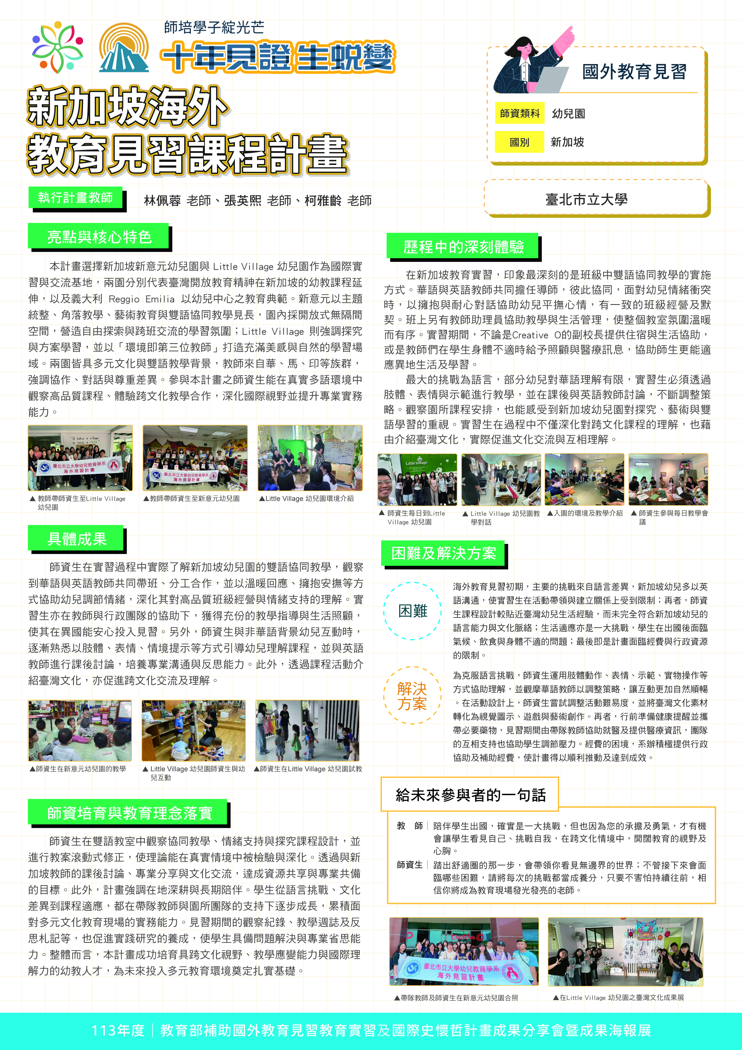 『 成果海報展介紹 』 本次展出由教育部補助,邀集全臺師資培育大學,共同呈現 111–113 年度國外教育見習及國際史懷哲計畫成果。透過 62件國外教育見習教育實習及國際史懷哲計畫,教師帶領師資生走入20個國家,從幼兒教育、雙語教學、STEAM 到國際志工服務,深化跨文化理解與教學專業。