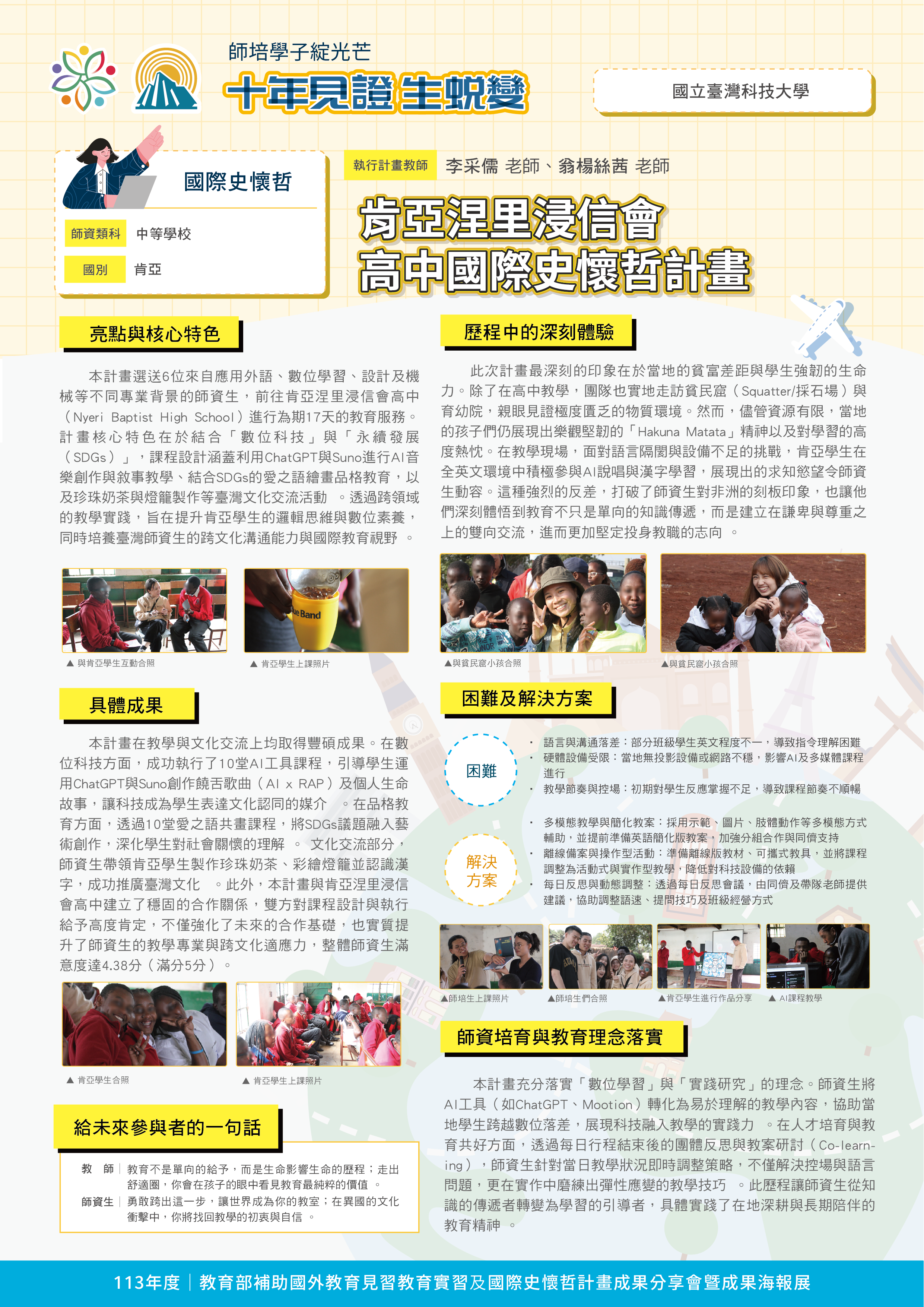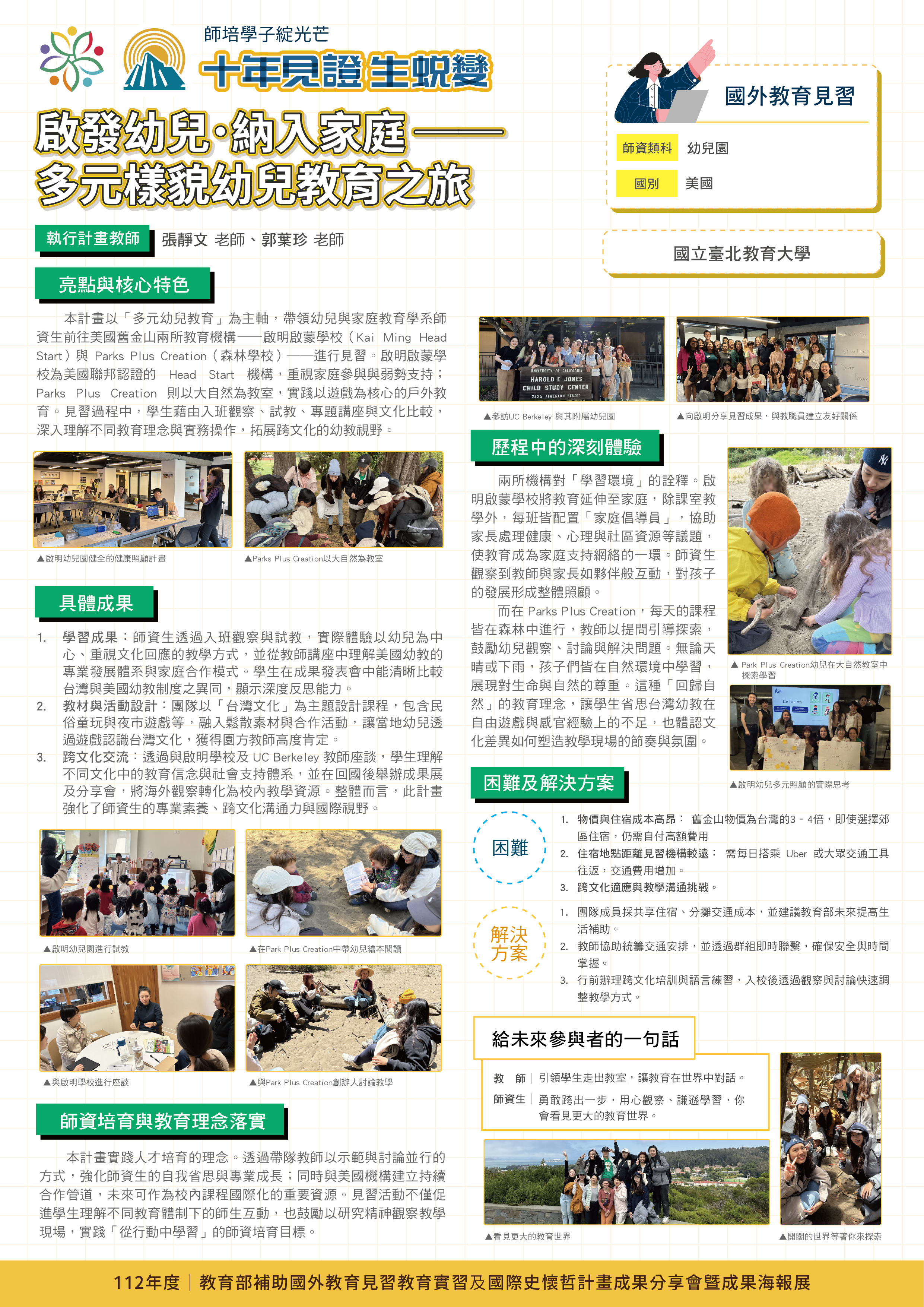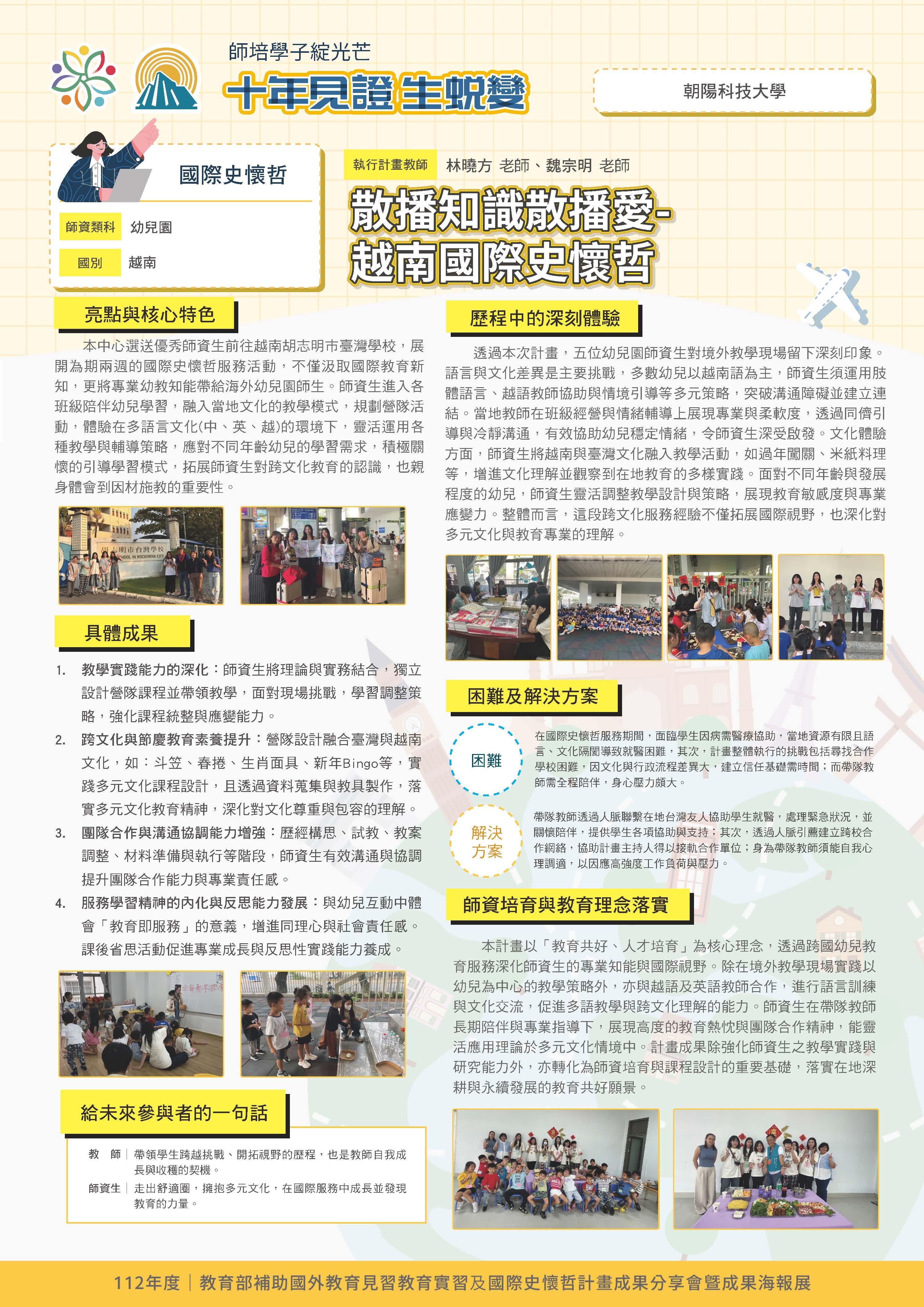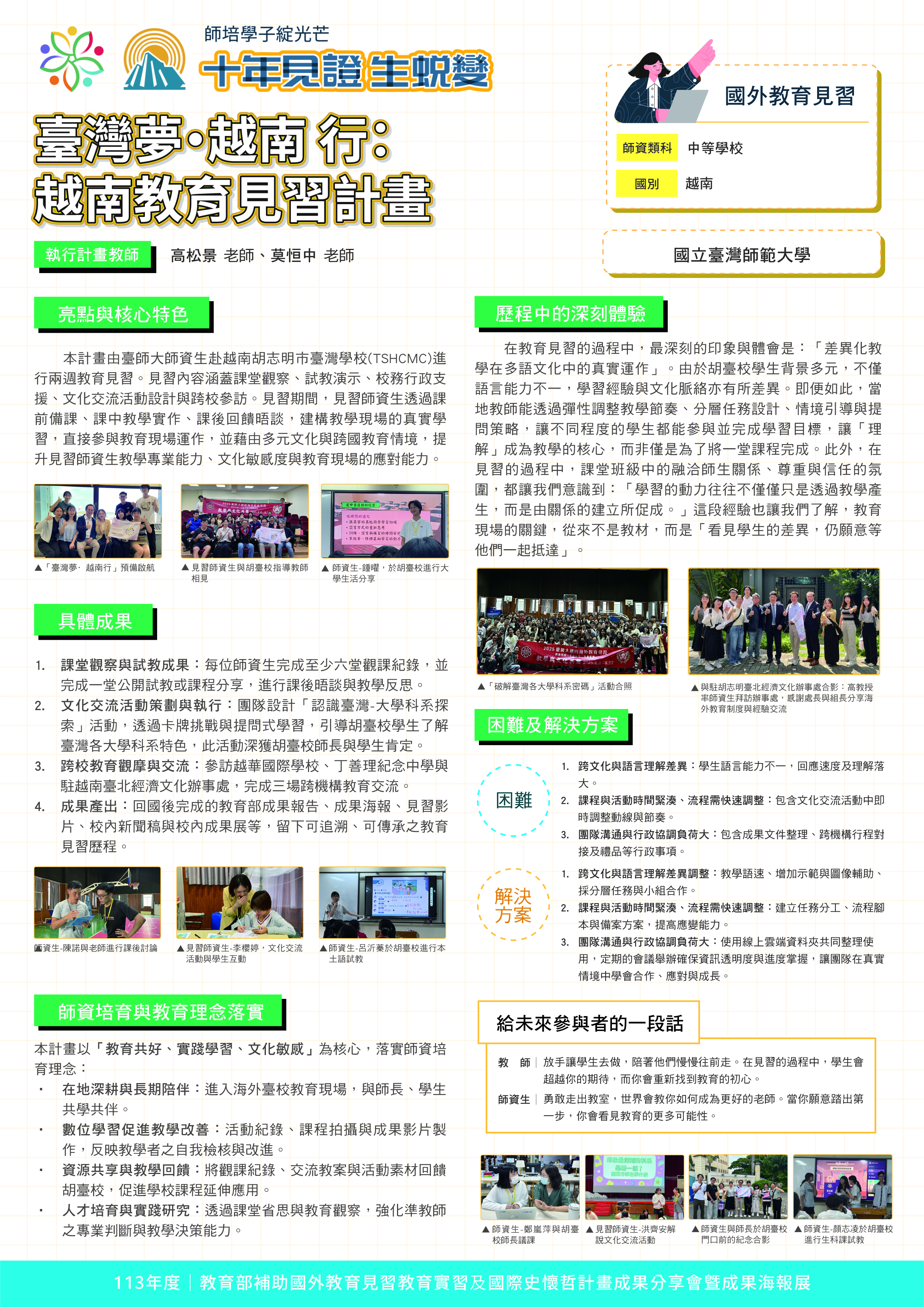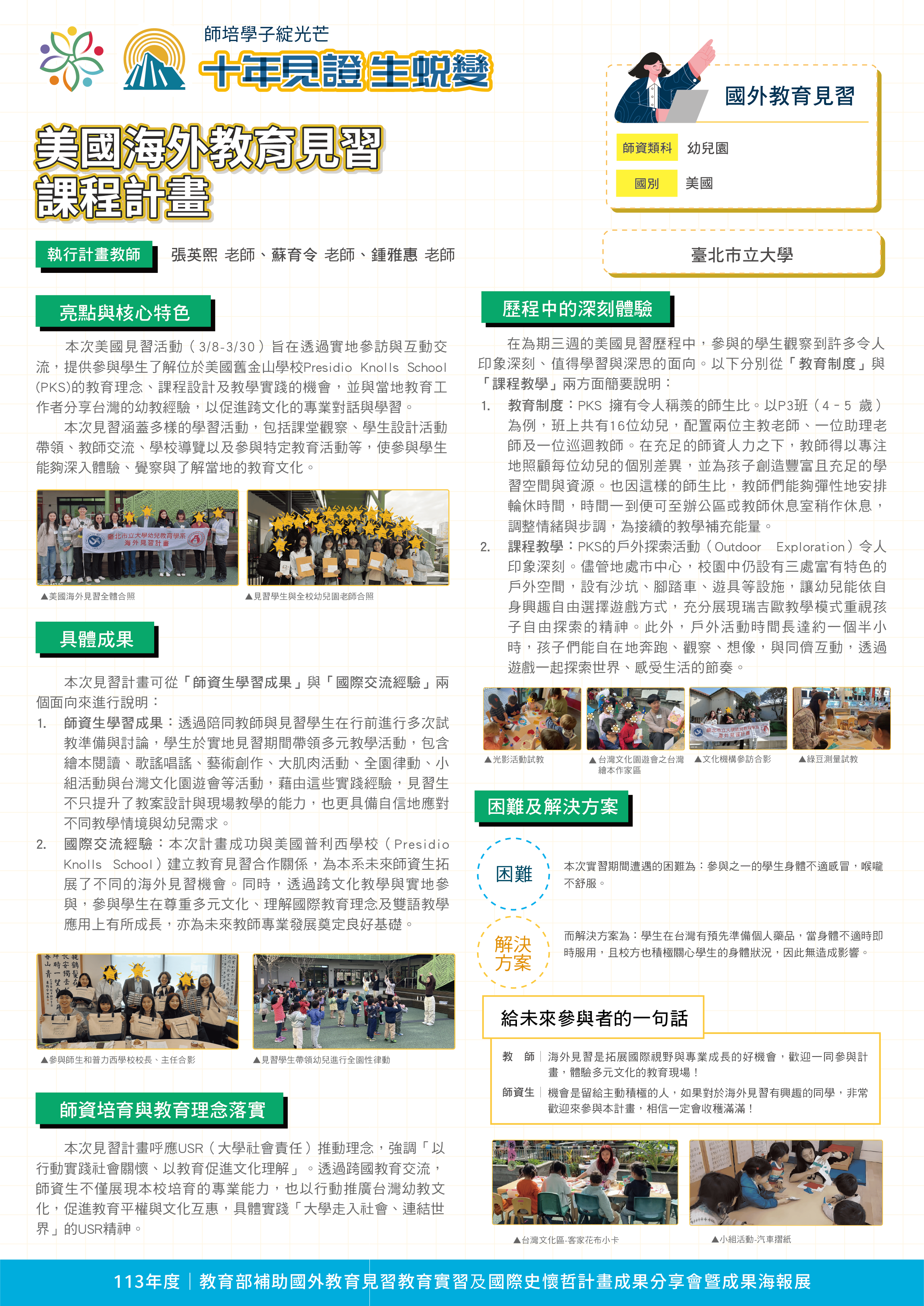 『 成果海報展介紹 』 本次展出由教育部補助,邀集全臺師資培育大學,共同呈現 111–113 年度國外教育見習及國際史懷哲計畫成果。透過 62件國外教育見習教育實習及國際史懷哲計畫,教師帶領師資生走入20個國家,從幼兒教育、雙語教學、STEAM 到國際志工服務,深化跨文化理解與教學專業。