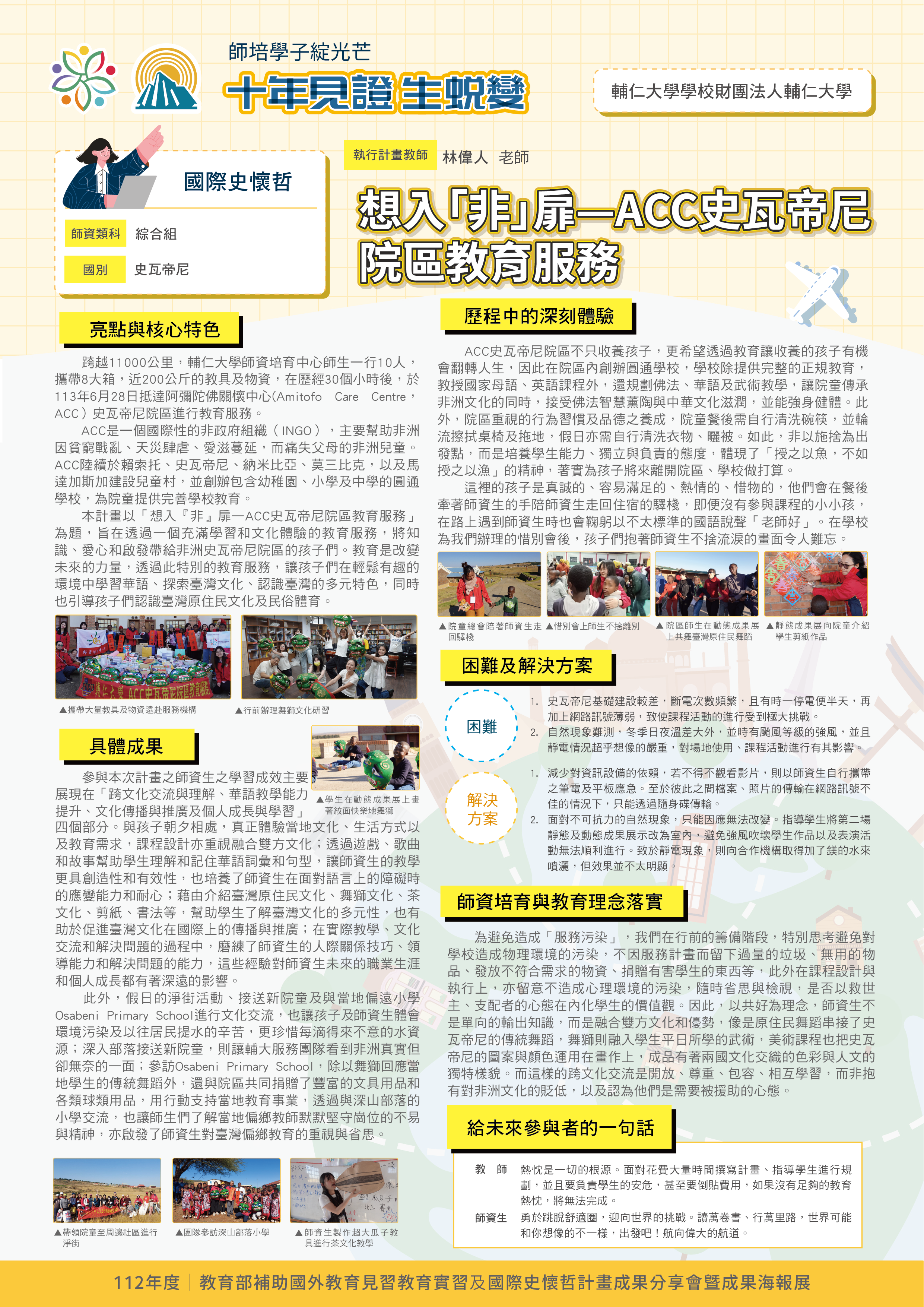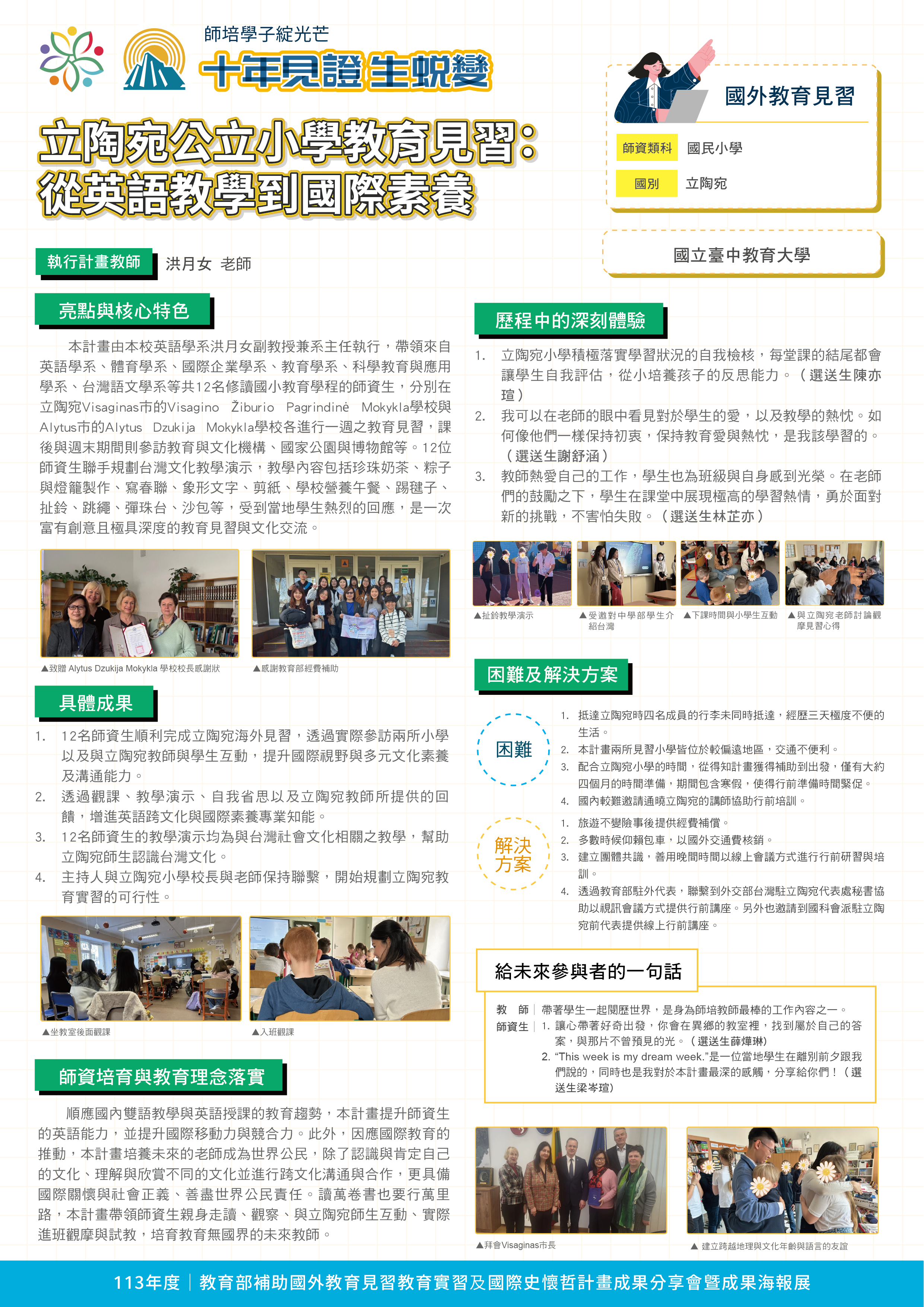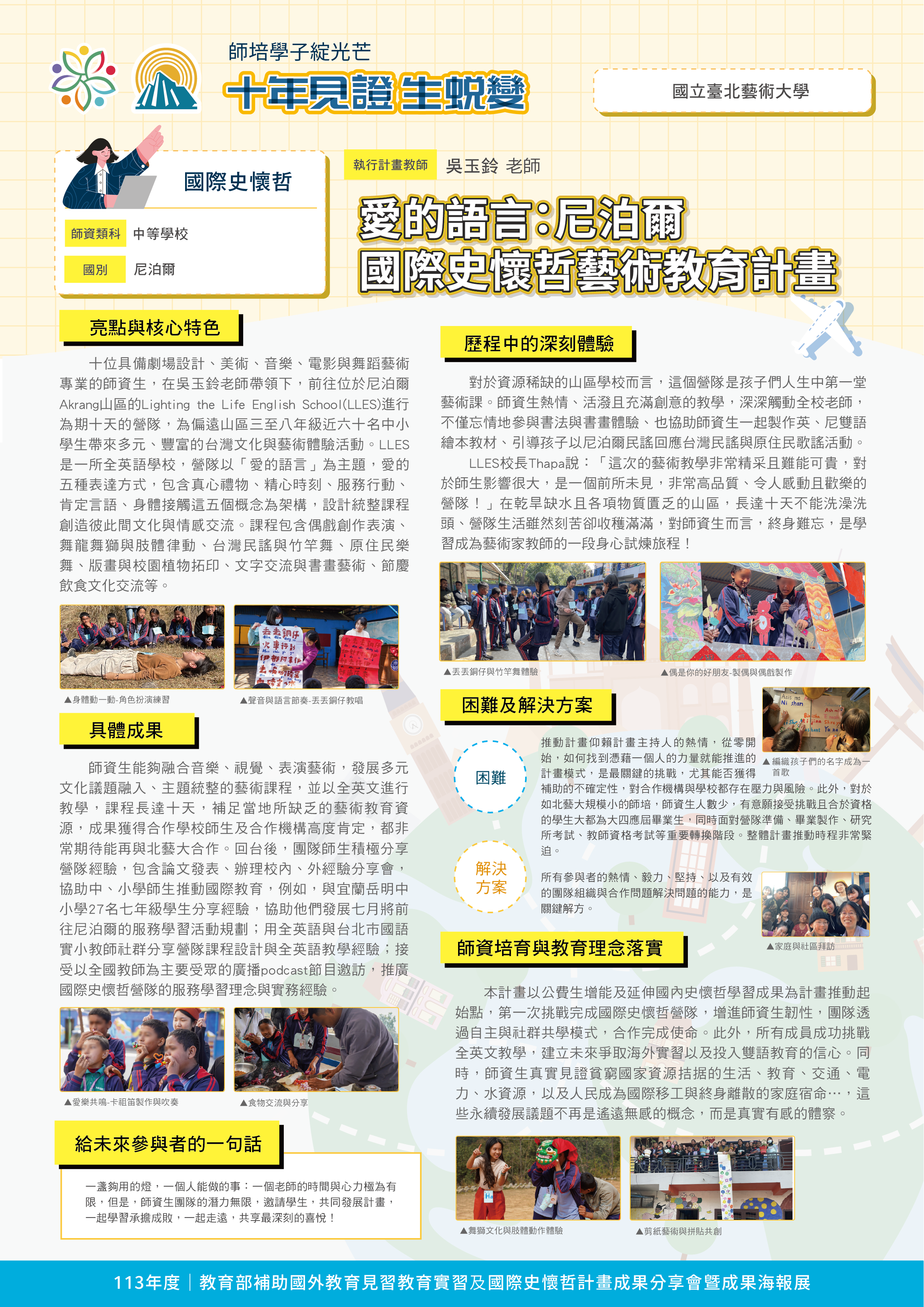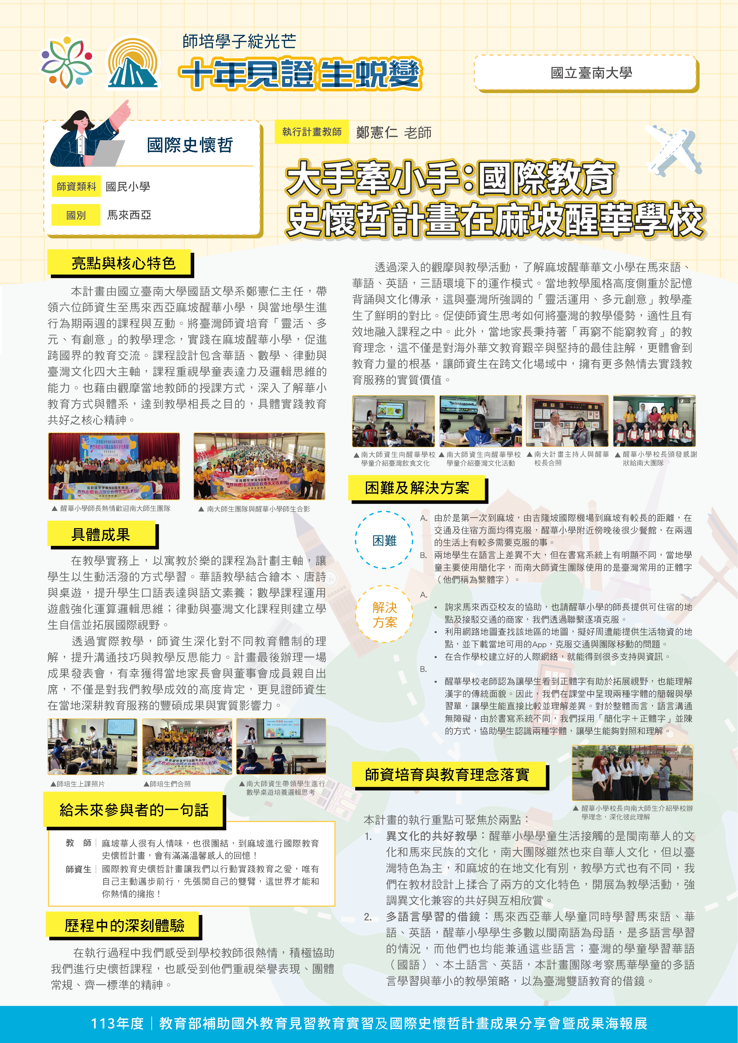 『 成果海報展介紹 』 本次展出由教育部補助,邀集全臺師資培育大學,共同呈現 111–113 年度國外教育見習及國際史懷哲計畫成果。透過 62件國外教育見習教育實習及國際史懷哲計畫,教師帶領師資生走入20個國家,從幼兒教育、雙語教學、STEAM 到國際志工服務,深化跨文化理解與教學專業。