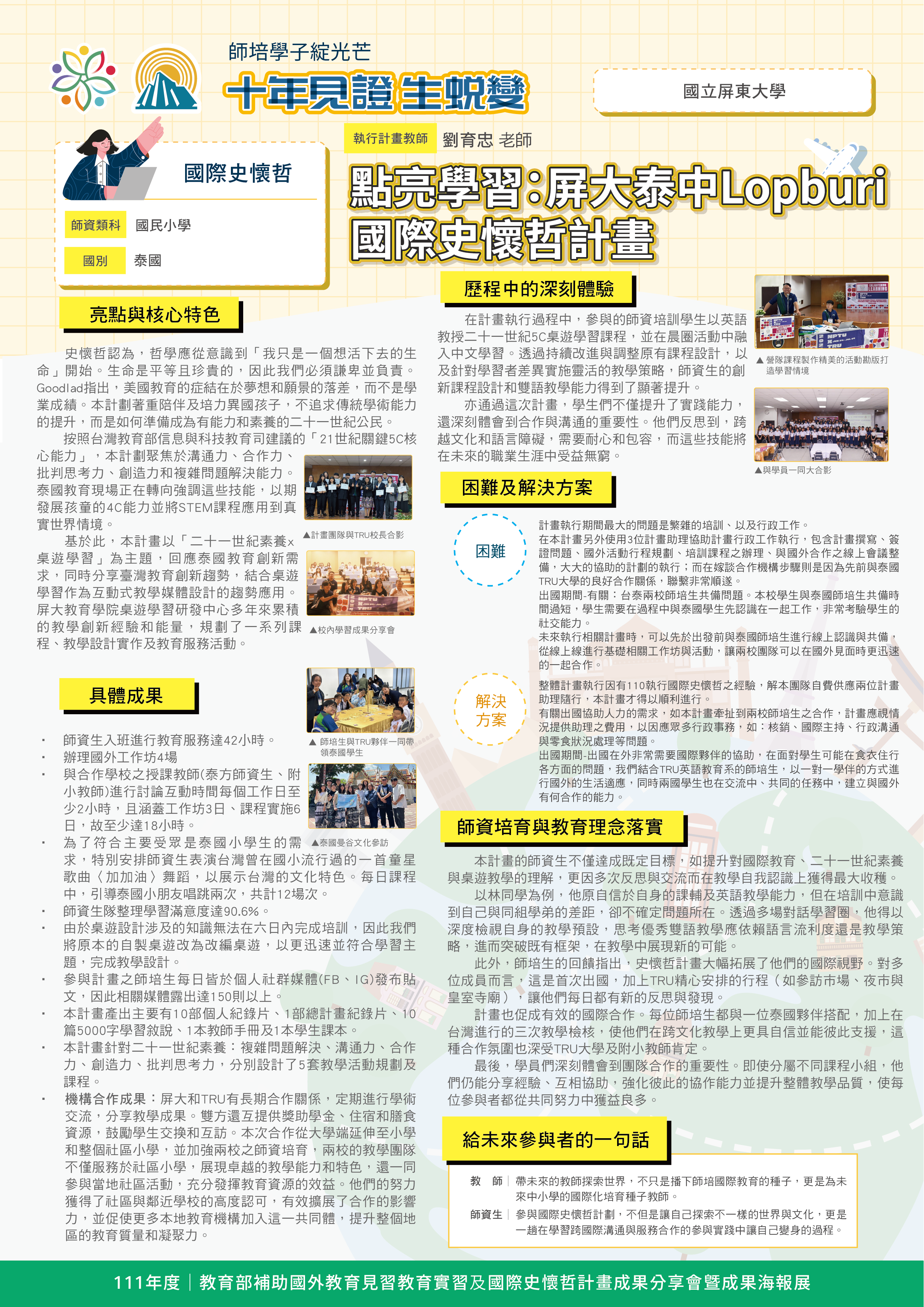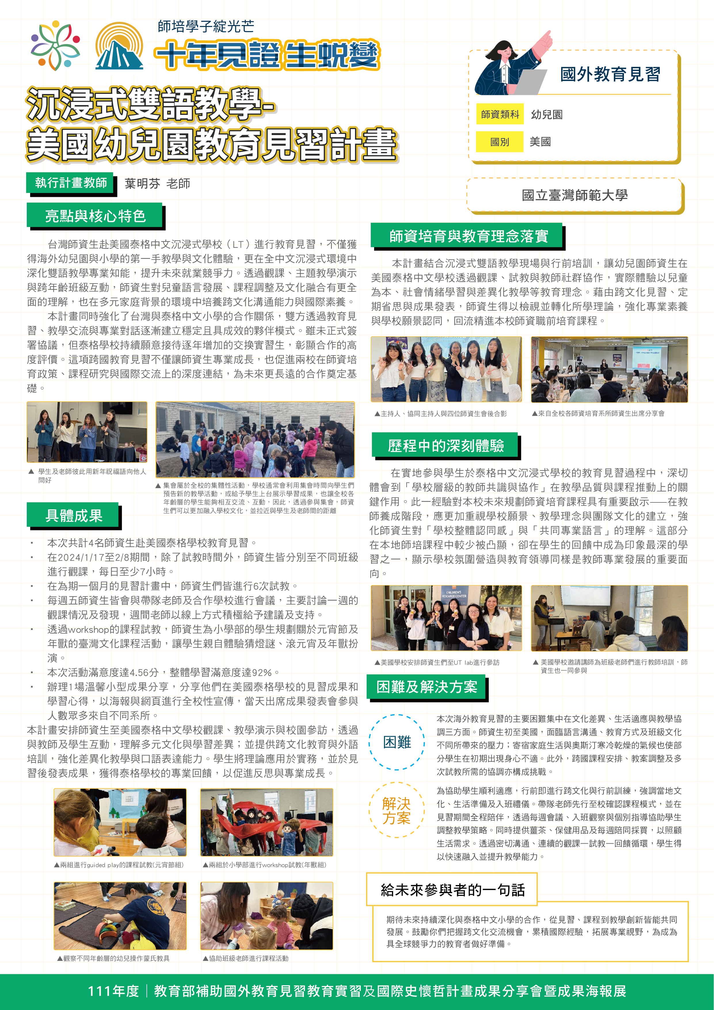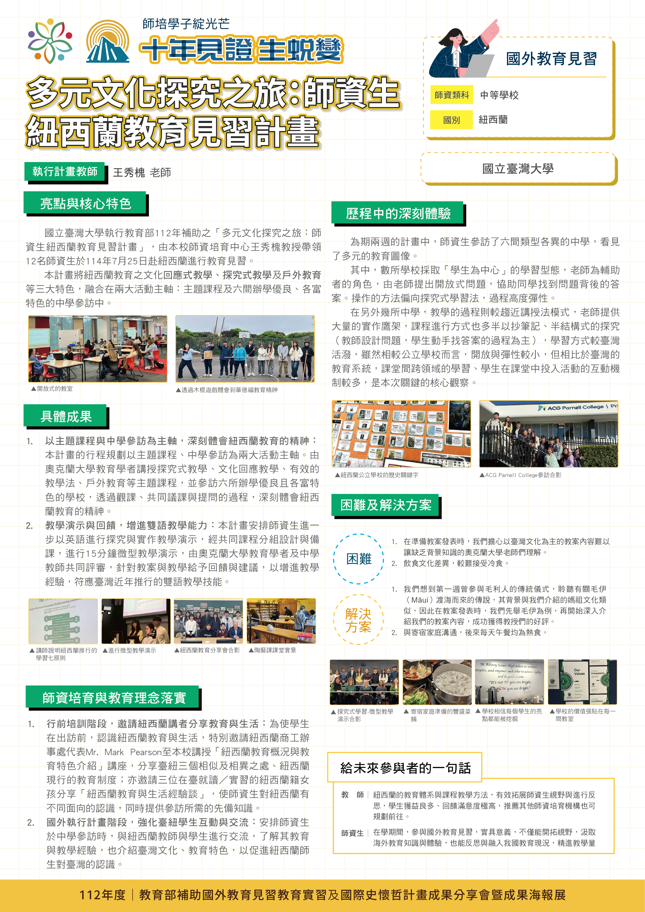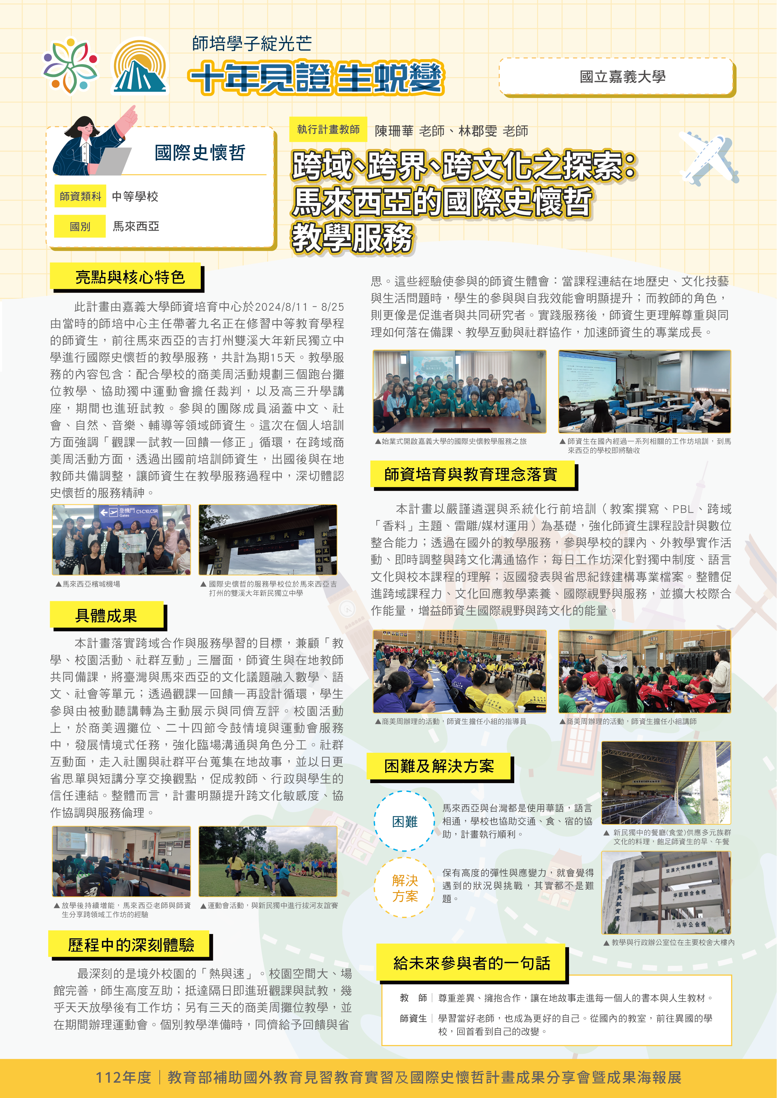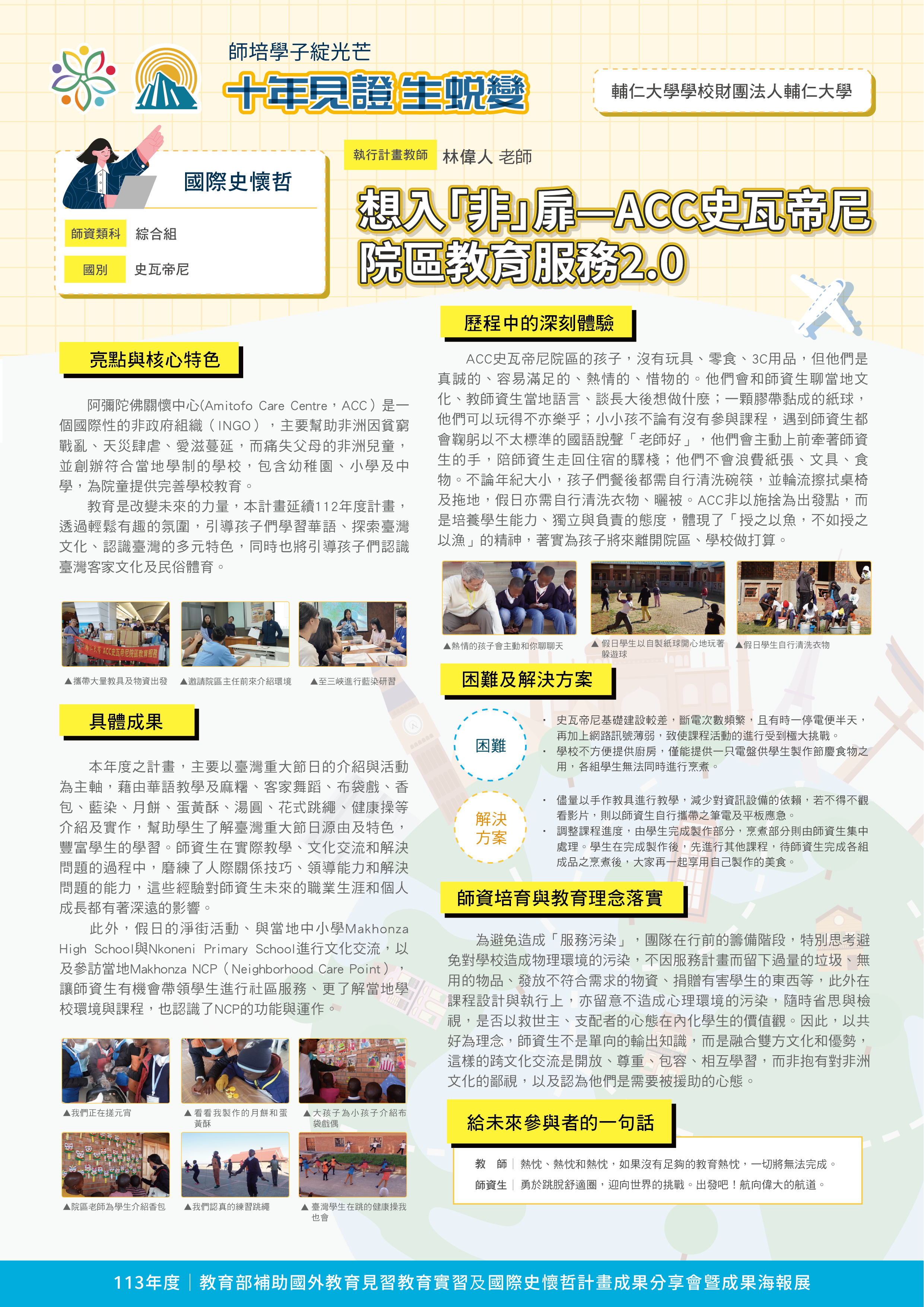 『 成果海報展介紹 』 本次展出由教育部補助,邀集全臺師資培育大學,共同呈現 111–113 年度國外教育見習及國際史懷哲計畫成果。透過 62件國外教育見習教育實習及國際史懷哲計畫,教師帶領師資生走入20個國家,從幼兒教育、雙語教學、STEAM 到國際志工服務,深化跨文化理解與教學專業。