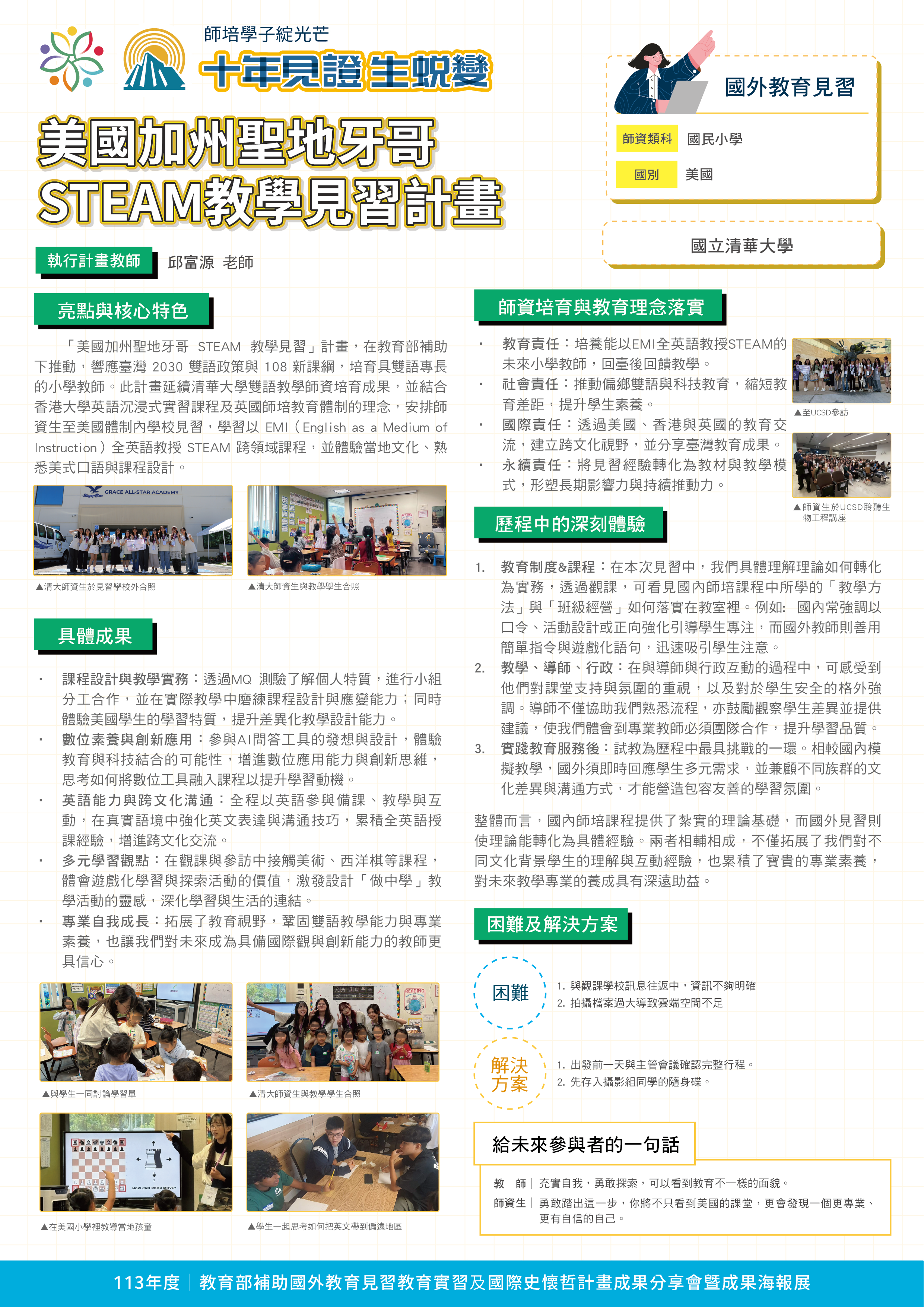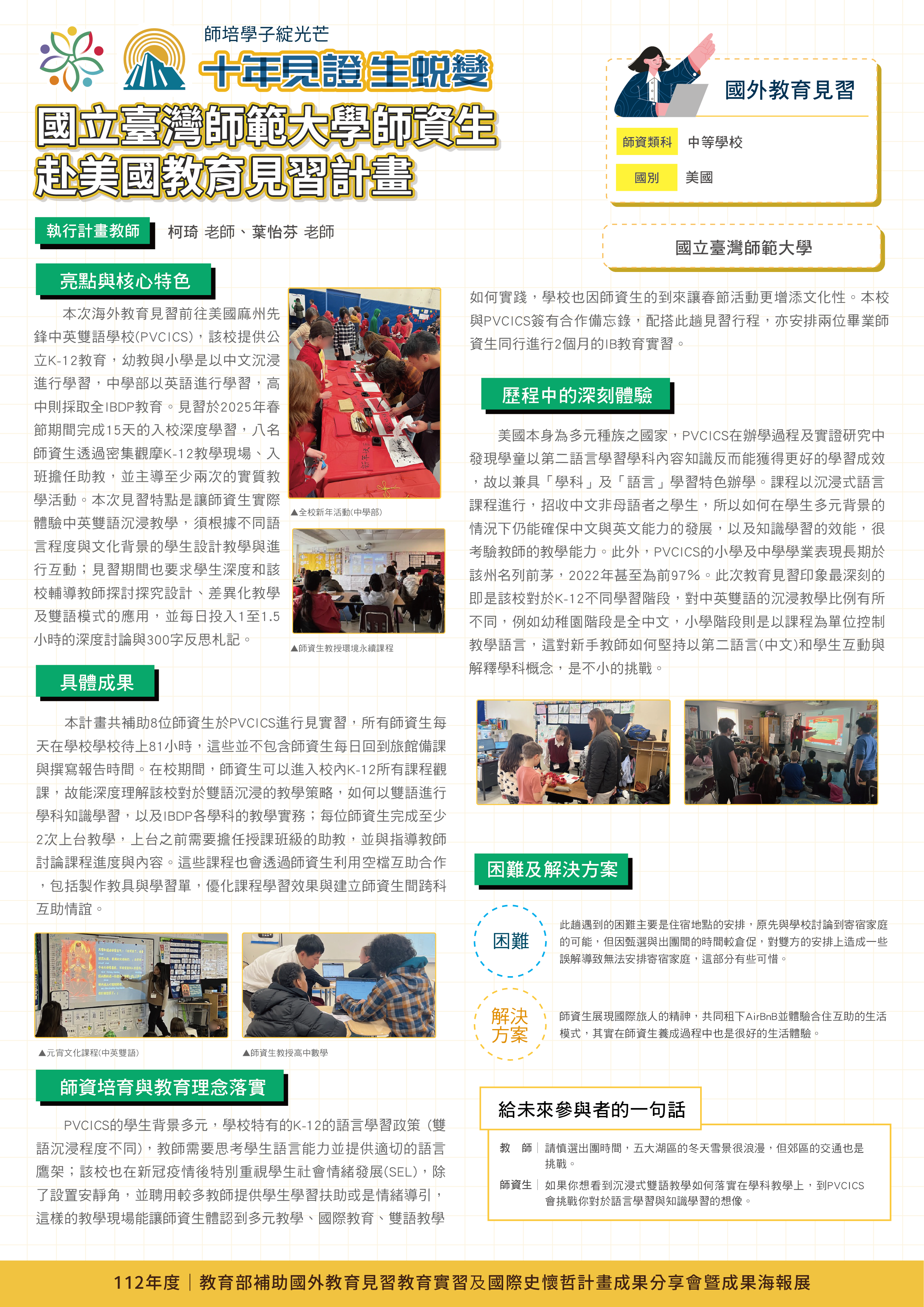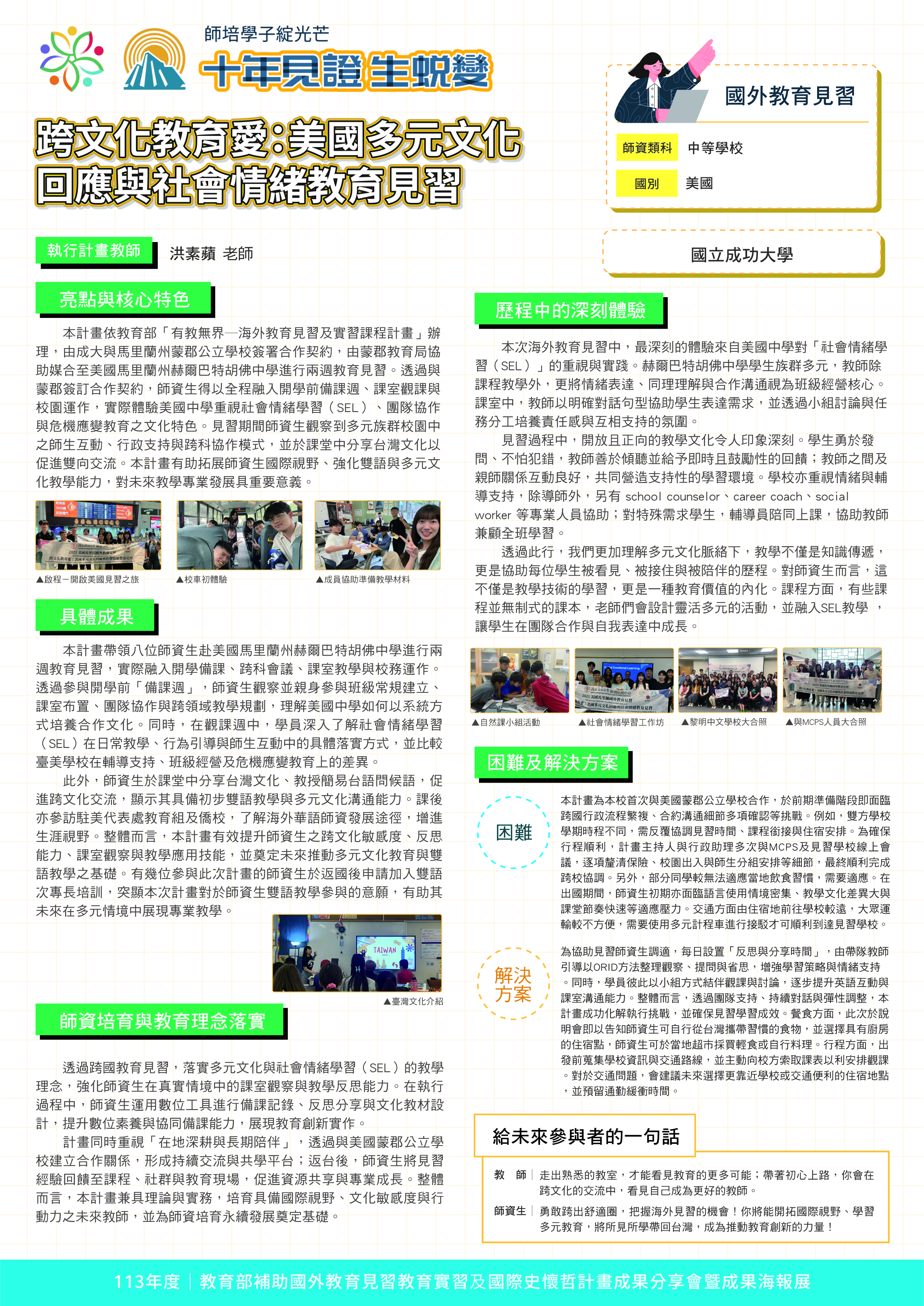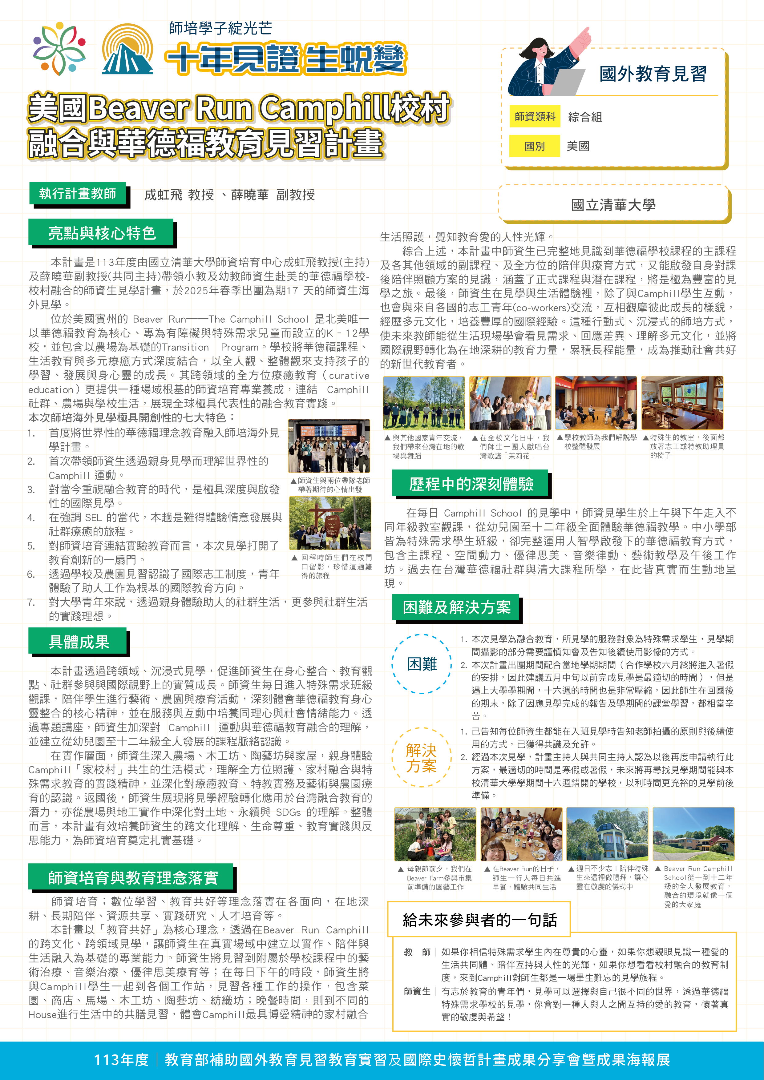 『 成果海報展介紹 』 本次展出由教育部補助,邀集全臺師資培育大學,共同呈現 111–113 年度國外教育見習及國際史懷哲計畫成果。透過 62件國外教育見習教育實習及國際史懷哲計畫,教師帶領師資生走入20個國家,從幼兒教育、雙語教學、STEAM 到國際志工服務,深化跨文化理解與教學專業。