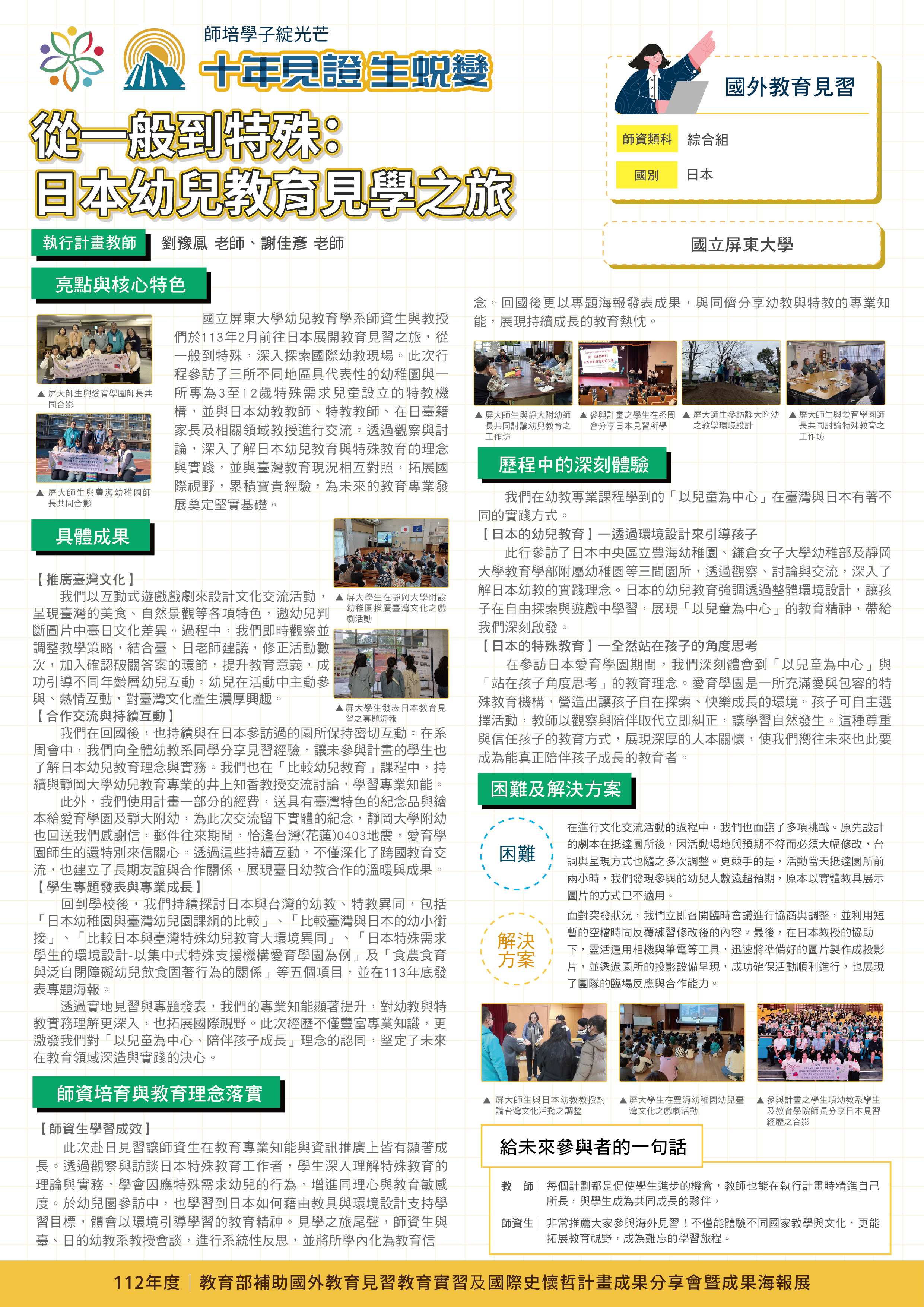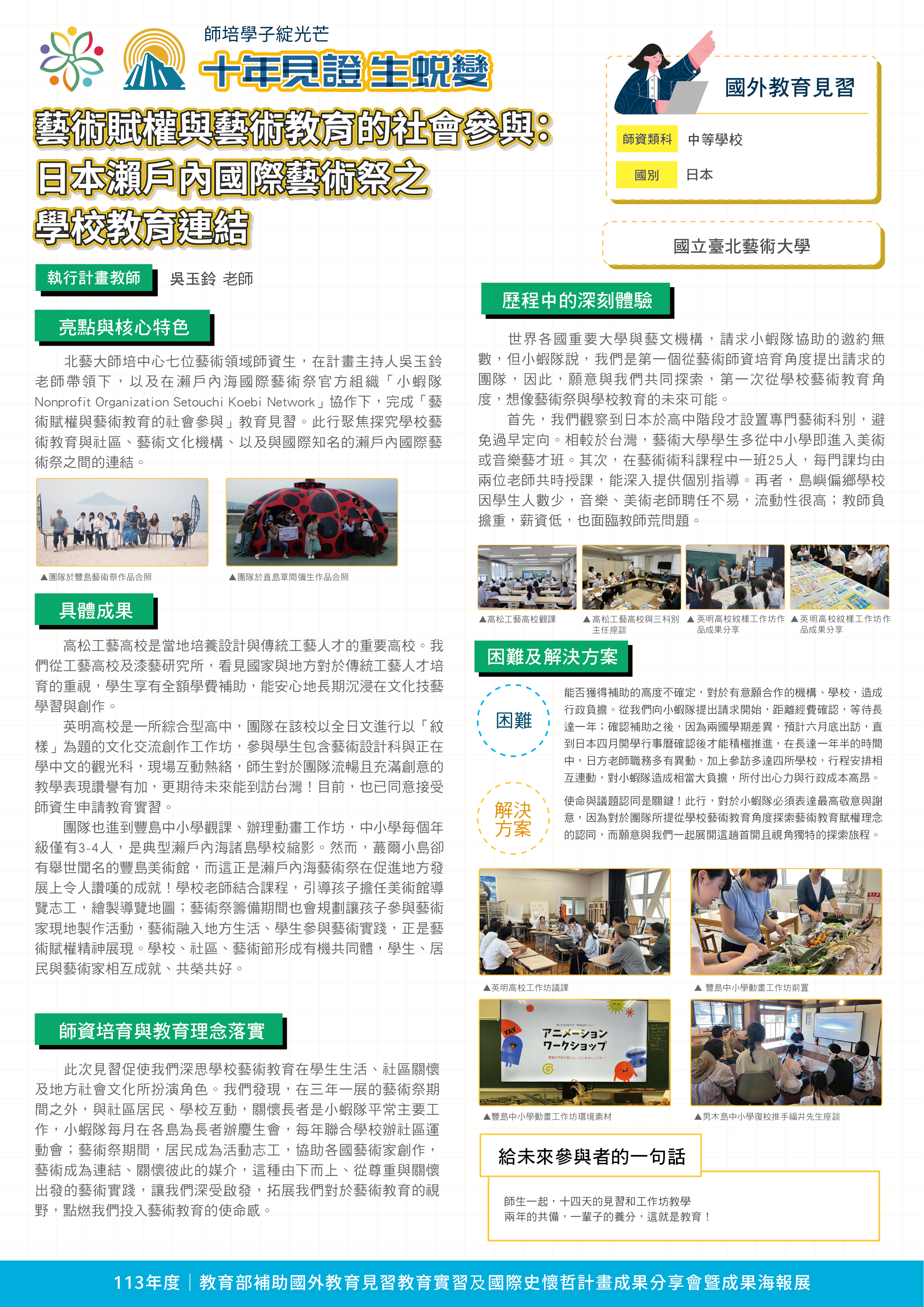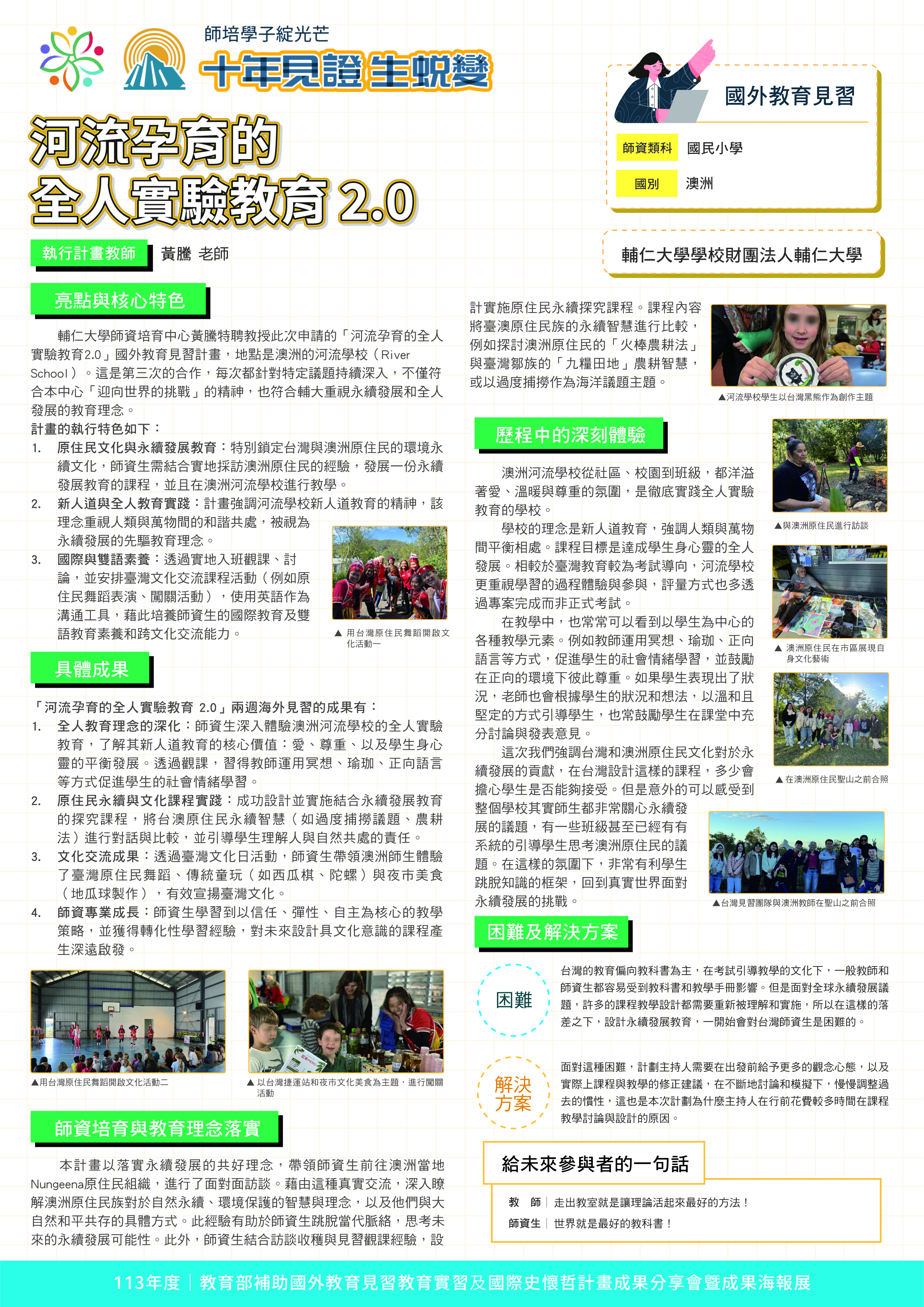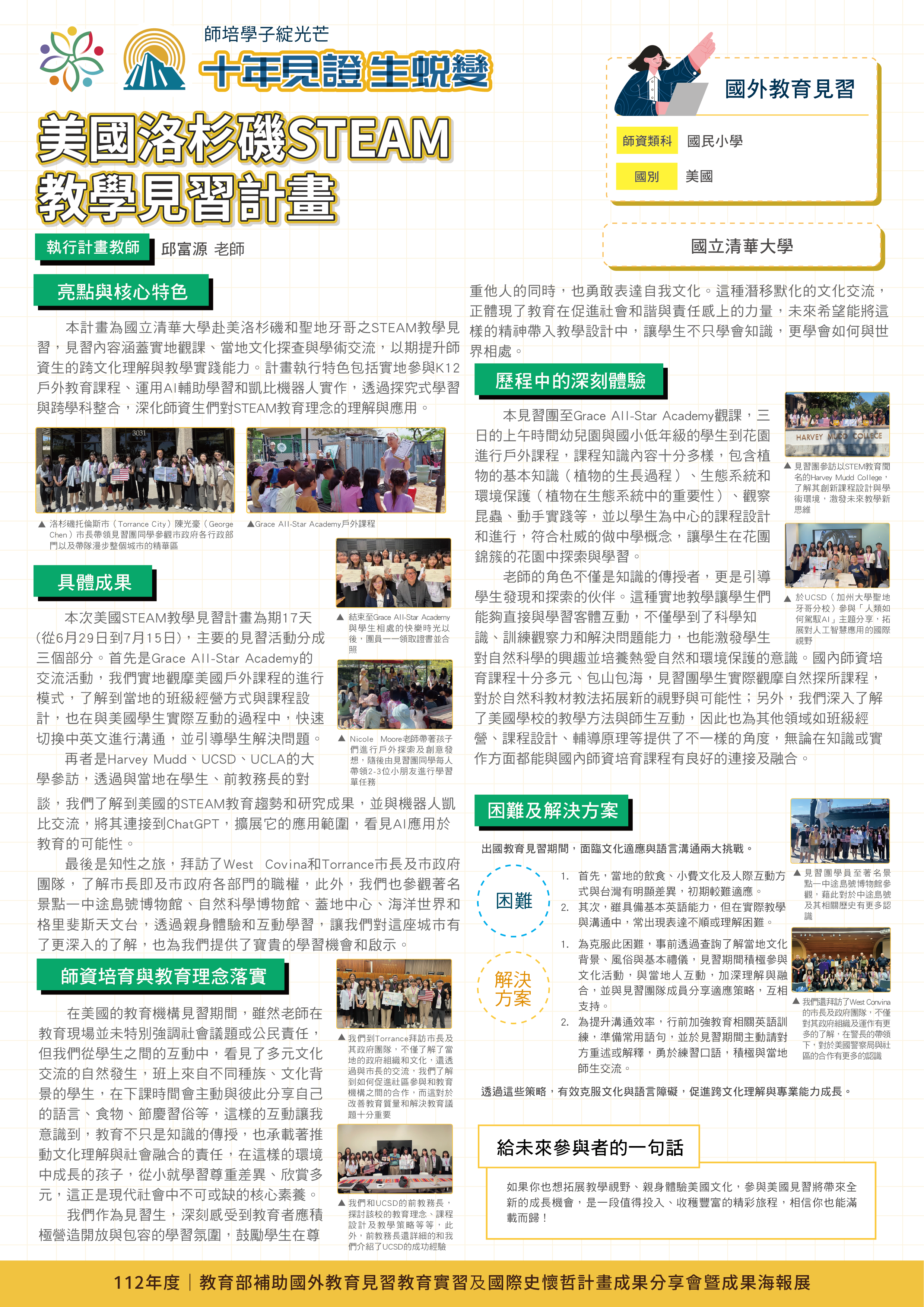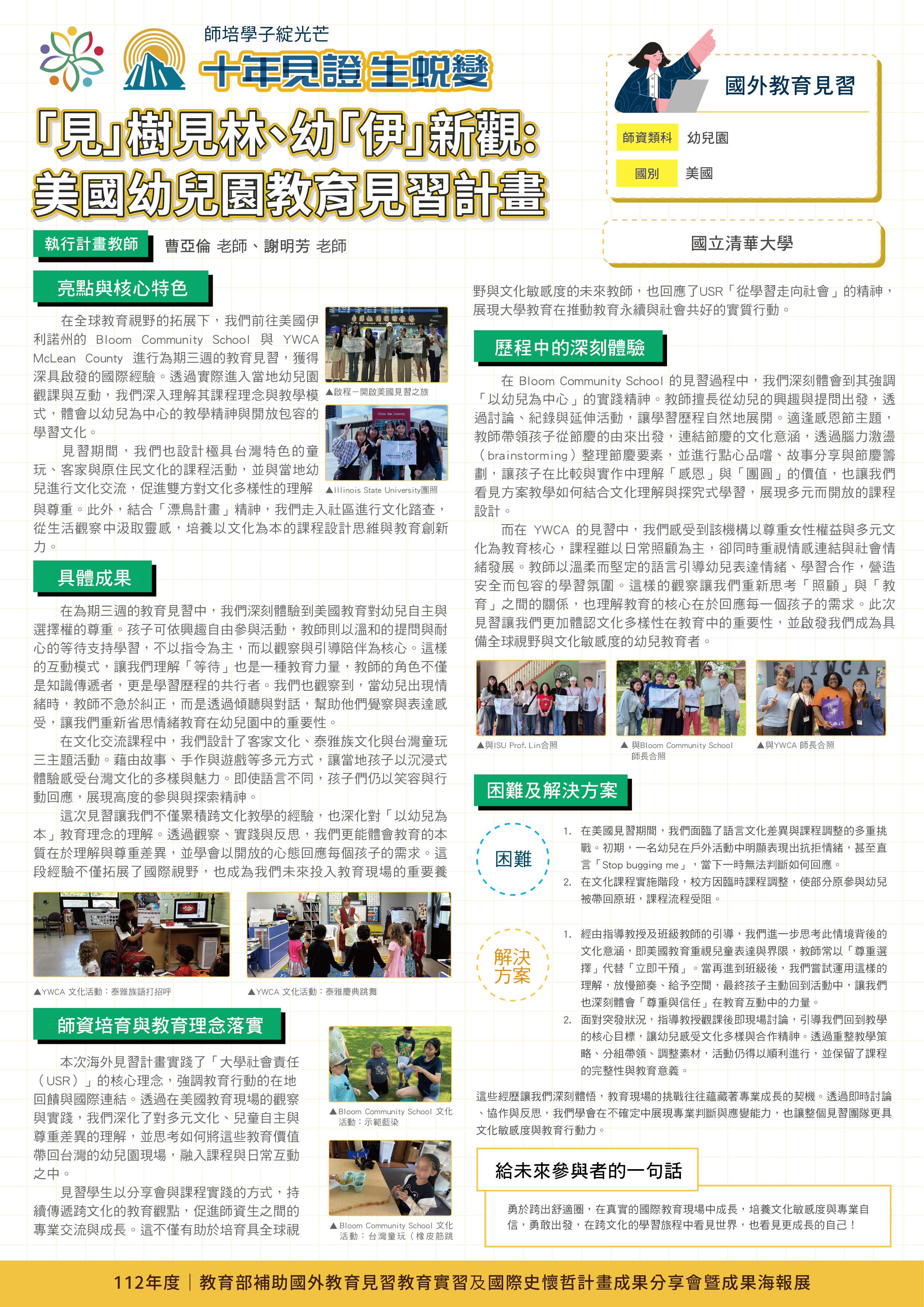 『 成果海報展介紹 』 本次展出由教育部補助,邀集全臺師資培育大學,共同呈現 111–113 年度國外教育見習及國際史懷哲計畫成果。透過 62件國外教育見習教育實習及國際史懷哲計畫,教師帶領師資生走入20個國家,從幼兒教育、雙語教學、STEAM 到國際志工服務,深化跨文化理解與教學專業。