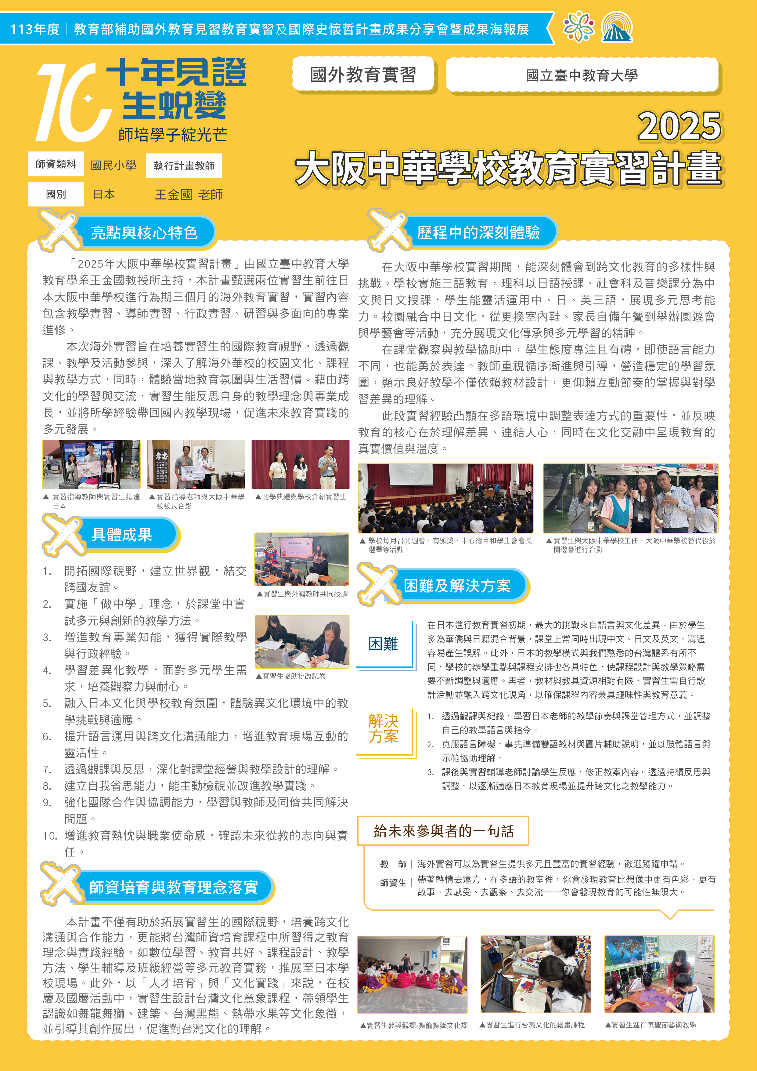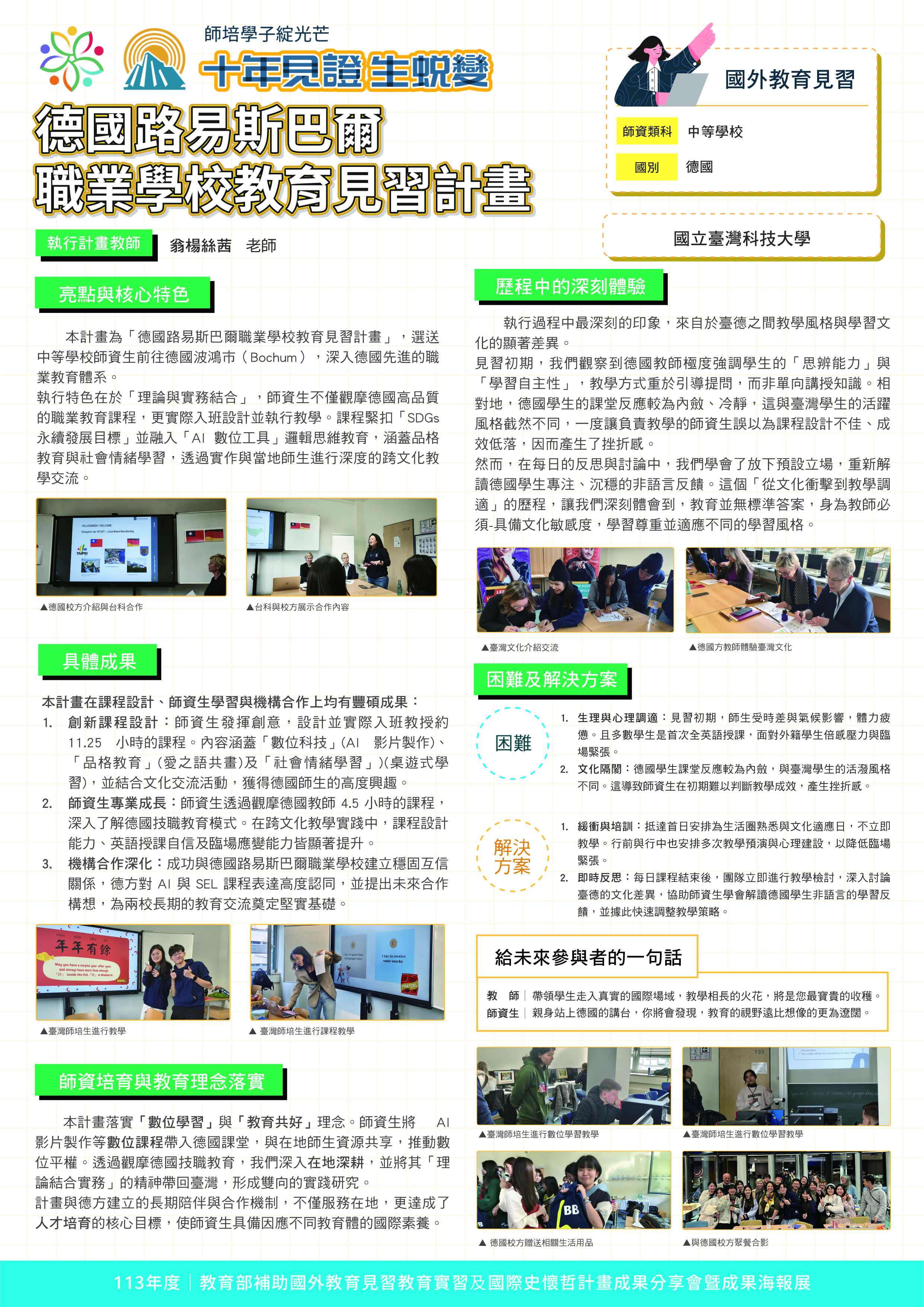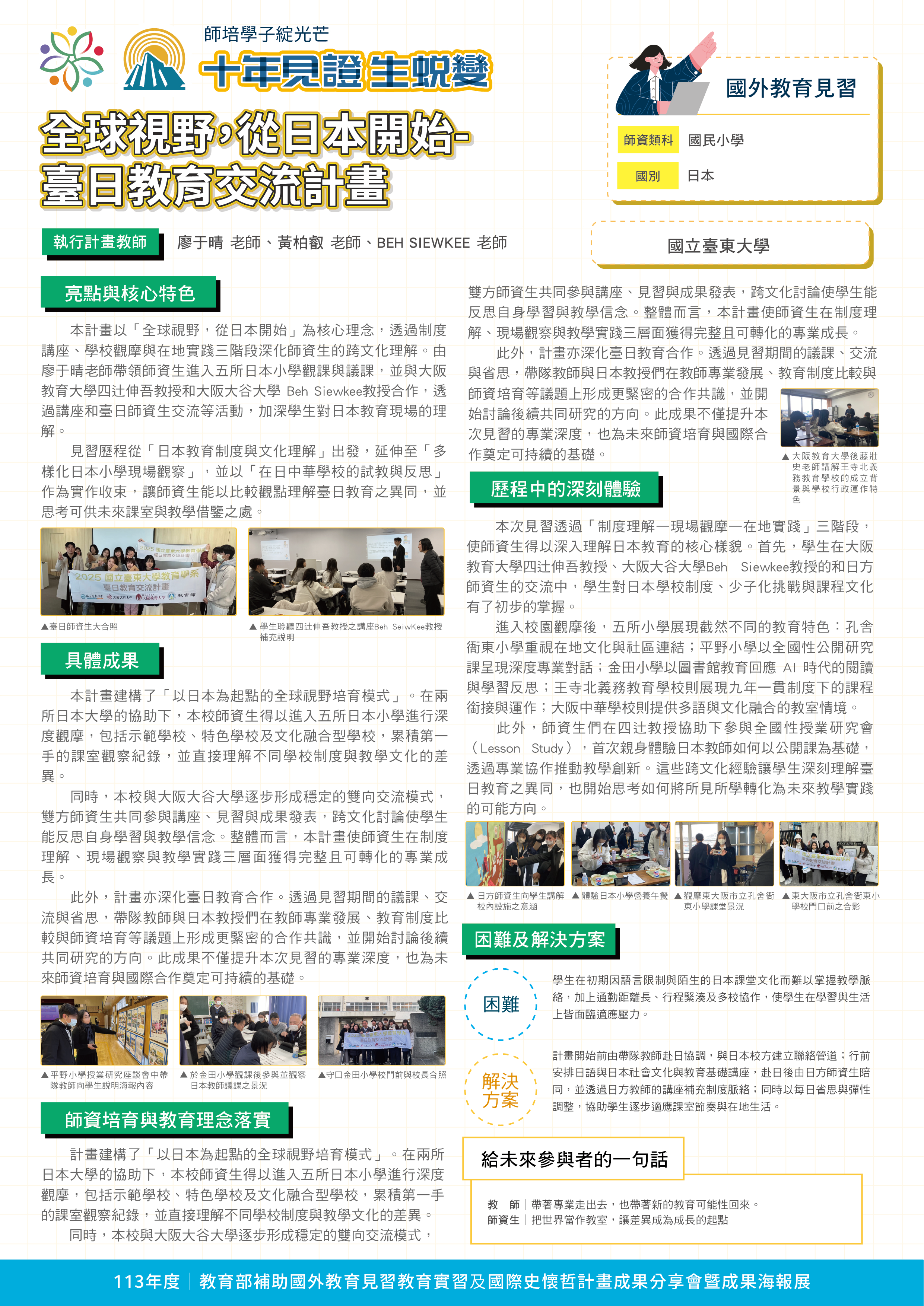 本次展出內容以 113 年度核定計畫為主軸,共計 34 件計畫、17 所學校參與;同時亦回顧 111–112 年度核定計畫成果 28 件、16 所學校,以簡介形式呈現,前述計畫方向成果,來自師資培育的實踐行動與國際教育合作經驗,體現出教育部及各校師生共同推動「教育無界」的願景與步伐。